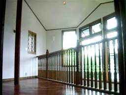 2Fホール 大きな窓から入る光は一日中ホールを照らします。時にはやさしく、時には燦々と・・・時の経つのを忘れてしまうようなそんな空間がここにはあるのです。床板にはカリンの無垢板を使用。