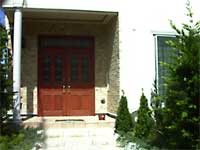 カナダ製の木製親子ドアを採用。 壁はクラシカルな石積みタイル、床には 素焼きの素朴な風合いのタイルを配して 訪れた方々にやさしい空間を提供。